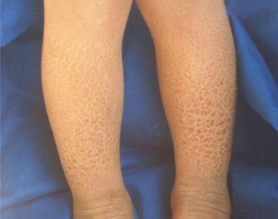 本型為常見的輕型魚鱗病,親代一方或雙方患病則家中常有患者,但無性別差異。常自幼年發病,成年后癥狀減輕或消失。皮損表現輕重不一,輕者僅冬季皮膚干燥,無明顯鱗屑,搔抓后有粉狀落屑。常見者除皮膚干燥外,尚可見灰褐色或深褐色菱形或多角形狀鱗屑,中央固著,邊緣游離。本病多對稱分布于四肢伸側及軀干,尤以肘膝伸側為著。屈側亦可出現,手背常有毛囊性角質損害,伴有掌跖過度角化。一般顏面、頭皮、肘窩、腋下、腮窩、外陰、及臀裂常不被侵犯。冬季加重,夏季減輕。患者常有異位性體質,如枯草熱及哮喘等。